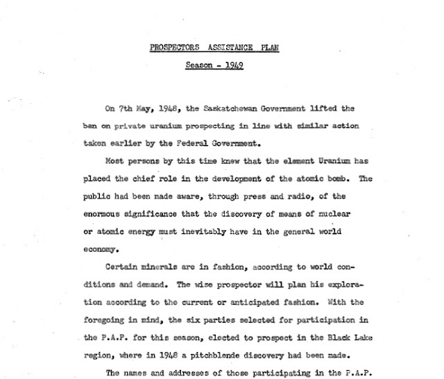 According to a document titled "Prospectors Assistant Plan, Season 1949" (see above) sent to me by Natalie Thompson of the La Ronge Precambrian Geological Laboratory, Nan "Di Lea" and John "Albricht" were Party #4 of the six parties. The text states that PAP No. 4 "made several uranium bearing discoveries in biotite and biotite-hornblende gneiss of granitized texture" at Robins Lake, 50 miles from John's Nisto find of 1948. According to the table on page 3, however, Party No. 4 did not make any claims in 1949. I have not yet discovered whether, during the course of their partnership, Nan and John staked any of claims together.